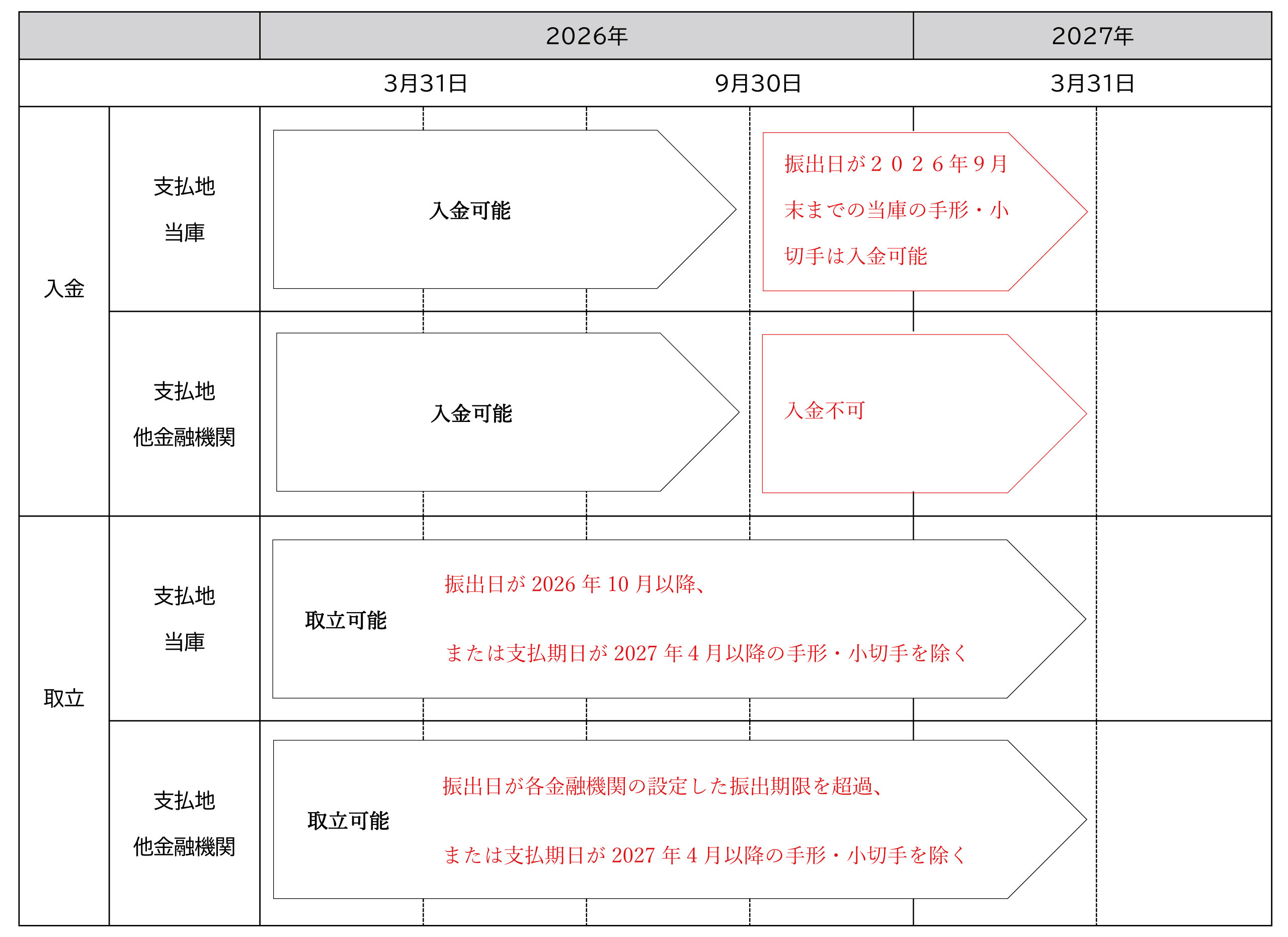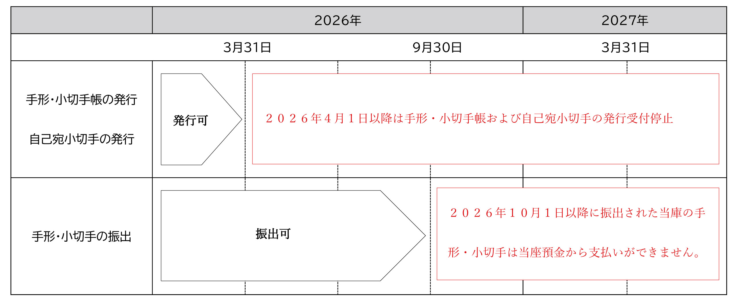 | 2026年3月31日 | 手形・小切手帳および自己宛小切手の発行受付終了 |